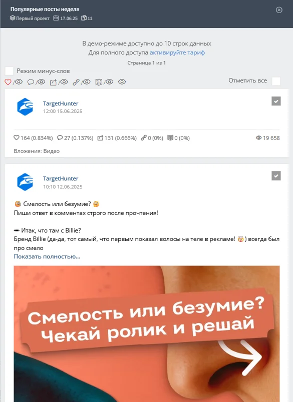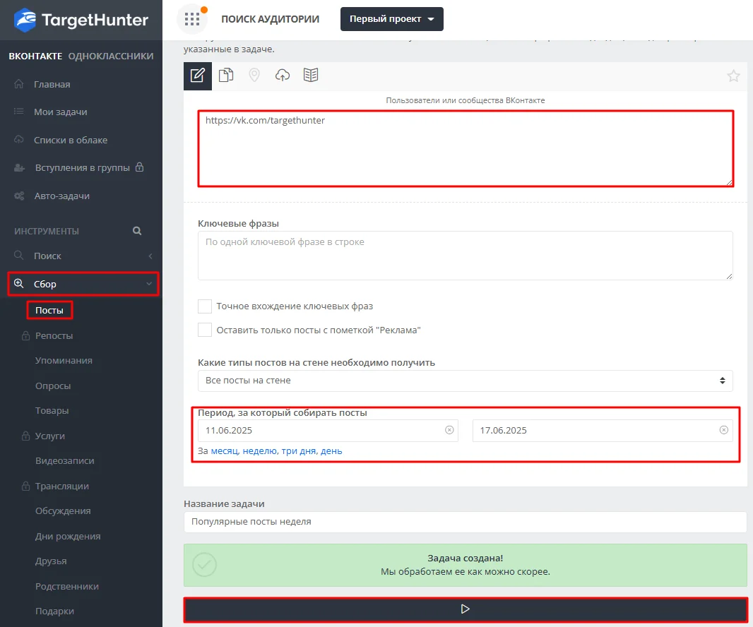 Target Hunter. В сервисе можно собрать все посты группы, найденной по названию, ключевому слову или по ссылке. А после в разделе «Сбор» → «Посты» узнать популярные посты за период, например, неделю.