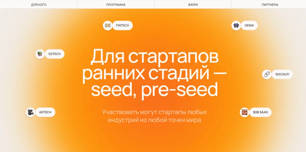 На этом экране сайта крупный заголовок выступает доминантой, а эмодзи с тегами по кругу служат акцентами.
