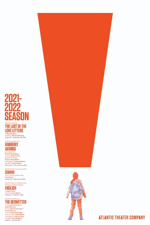 На картинке ниже — постер Atlantic Theater 2021-22 Season. Львиную доля пространства занимает оранжевая фигура в виде света софита, которая является логотипом театра. Под ней изображен человек, смотрящий снизу вверх на большое искусство. Несмотря на то, что композиция симметричная относительно вертикальной оси, в ней тоже есть динамика: большая фигура «давит» на иллюстрацию с человеком, есть ощущение, что она нестабильна и может упасть. Надписи в нижней половине макета справа и слева помогают сбалансировать картинку, чтобы этот эффект «давления» от крупной фигуры сверху не был слишком интенсивным и не вызывал тревогу.