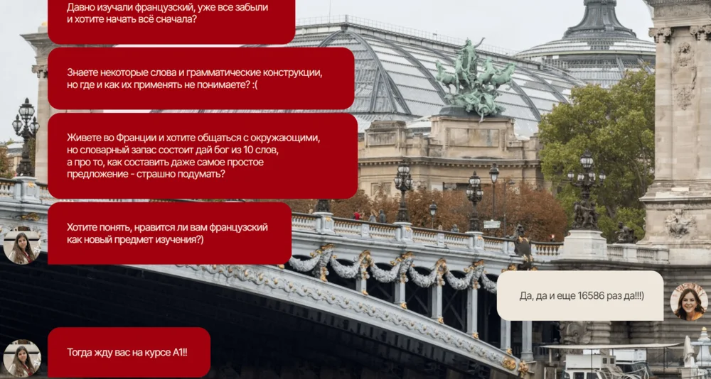 Другой пример — раздел на сайте курсов французского языка, выполненный в виде переписки между преподавателем и учеником. Всем знакомый формат, который легко воспринимать: мы видим сообщения от собеседника слева, читаем переписку сверху вниз.