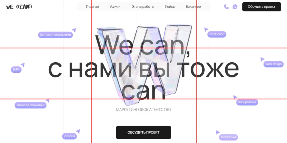 На сайте маркетингового агентства We ((can)) логотип и слоган находятся по центру блока. Они несут главную смысловую нагрузку.