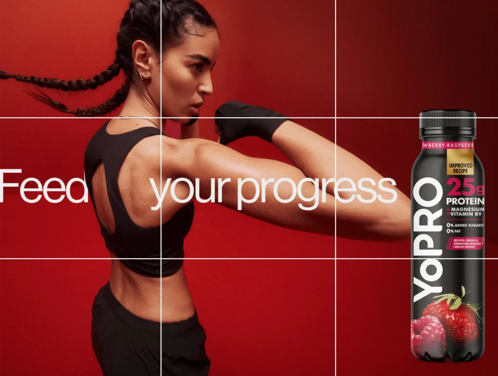 Правило третей использовала и компания Danone в рекламе протеиновых йогуртов. На изображении фигура девушки расположена в районе левой вертикальной линии, а главная часть слогана — в центре.