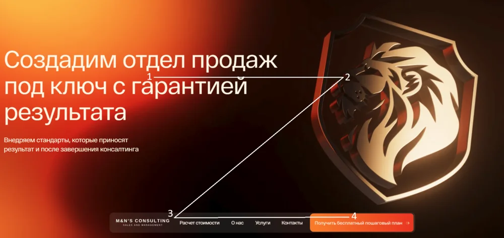 Эта схема часто используется в реальных проектах. Ниже — сайт M&N's Consulting. В первой зоне — оффер, во второй — логотип, в третьей — меню, которое выводит в четвертую область, где находится кнопка с целевым действием.