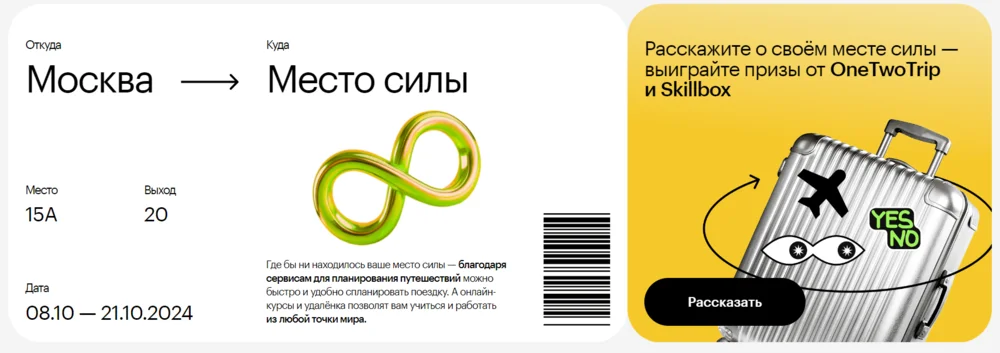 Или — пример лендинга с конкурсом от Skillbox и OneTwoTrip. Блок оформлен в виде билета, где крупным шрифтом слева направо указаны места отбытия и прибытия: «Москва — Место силы». Внизу слева идет второстепенная информация, а справа — текст про сервис для планирования путешествий.