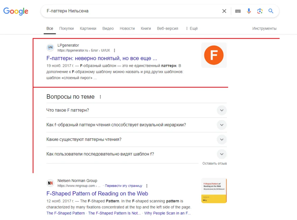 Принцип предполагает, что активные зоны расположены в форме буквы F. Такую схему применяют в дизайне поисковых систем. Ниже — интерфейс Google.