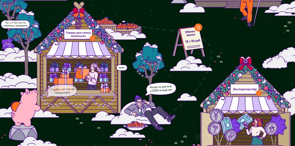 Рассмотрим два новогодних лендинга: первый — от банка «Точка», второй — от «Инфосистемы Джет». На обоих нужно кликать на объекты, чтобы открывалась возможность выполнить какое-либо действие.