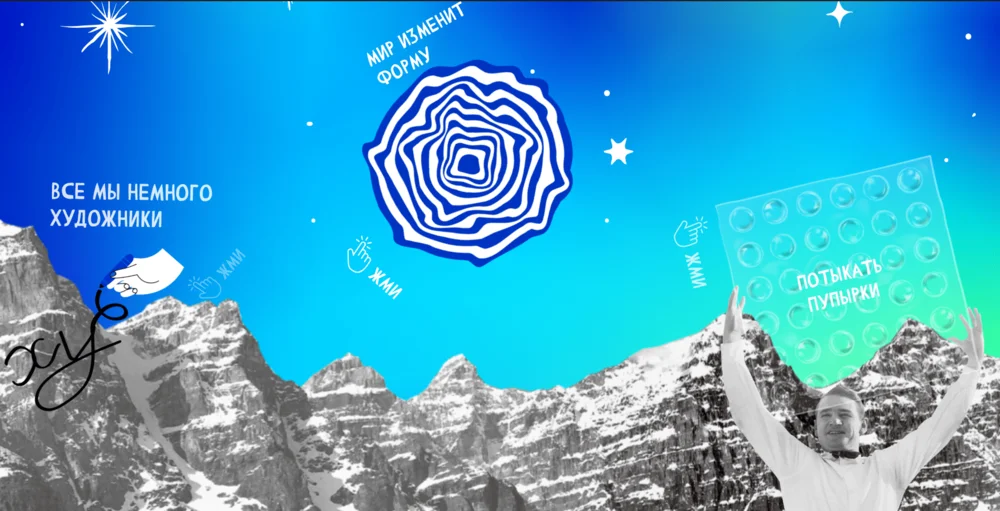 Интересно выглядит сочетание динамики и статики на сайте «Театра на Цветном». Анимированные округлые элементы уравновешиваются статичными, симметрично расположенными, силуэтами рук.
