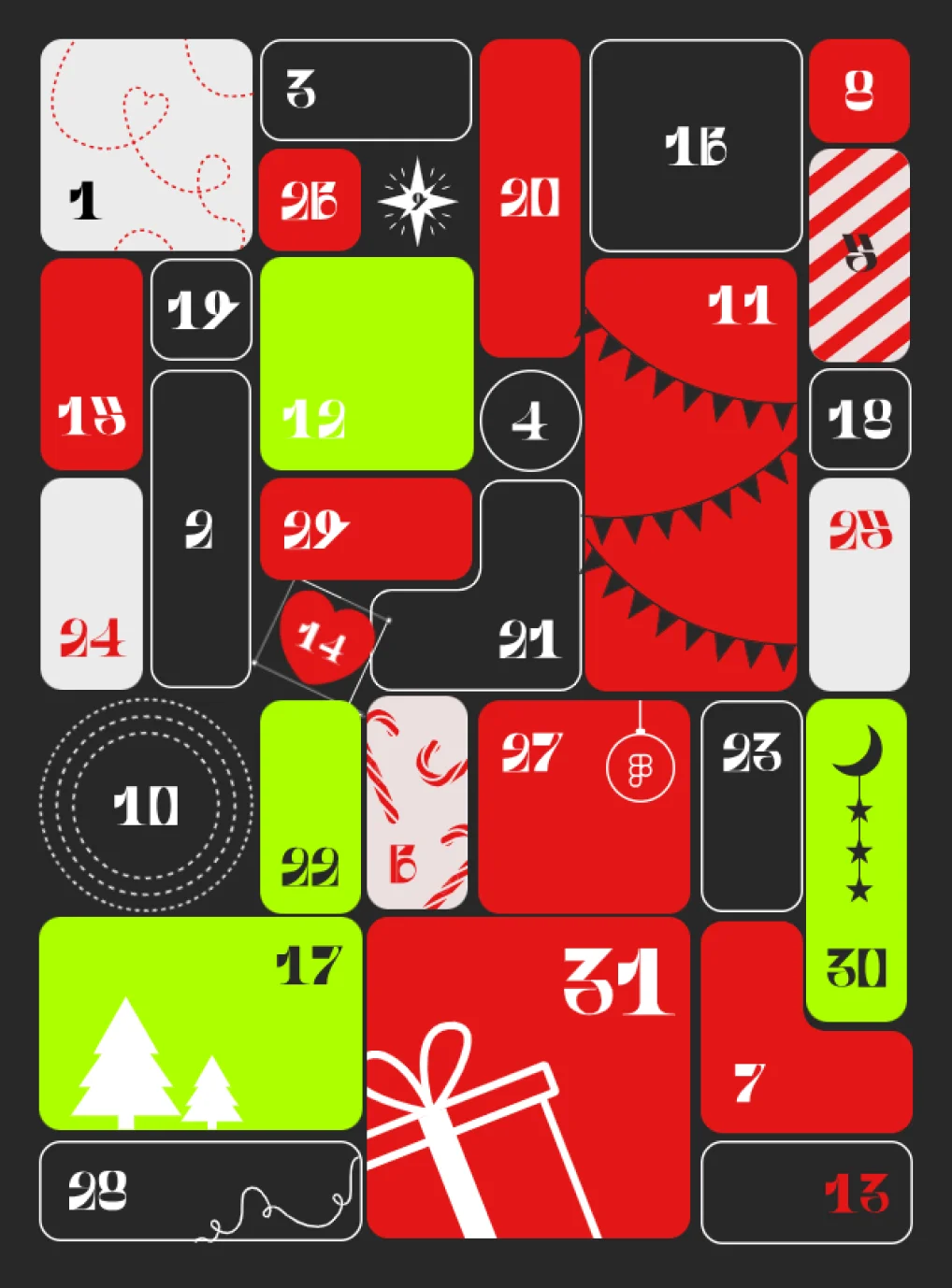 На примере адвент-календаря видно, что обычные квадратные ячейки выглядят статично, а наклоненные, округлые или с дополнительными элементами внутри кажутся более динамичными. Внутри ячеек также есть статичные элементы (цифры, елочки) и динамичные (гирлянды, подарок).
