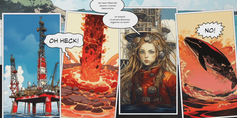 Ниже — комикс про историю нефти. Вторая и четвертая картинка содержат больше динамики за счет наклона и брызг. Первая и третья картинка более ровные и статичные.