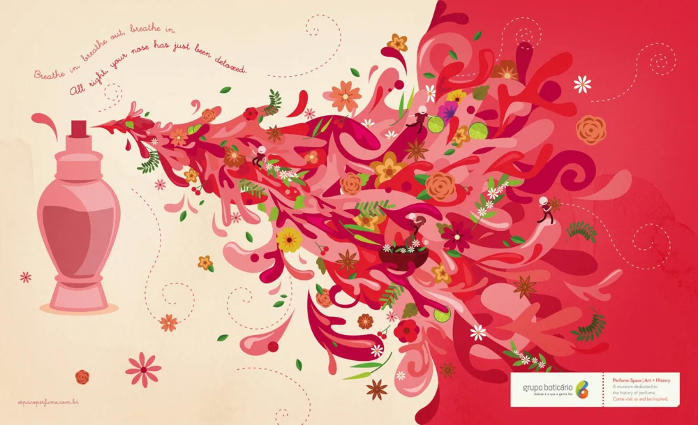 Следующее изображение создано для рекламной кампании бразильского бренда косметики и парфюмерии Grupo Boticário. Из флакона выплескиваются капли, среди которых можно разглядеть цветы и бегущих человечков. Флакон на картинке статичный, но в фокусе внимания — динамичная композиция из брызг.