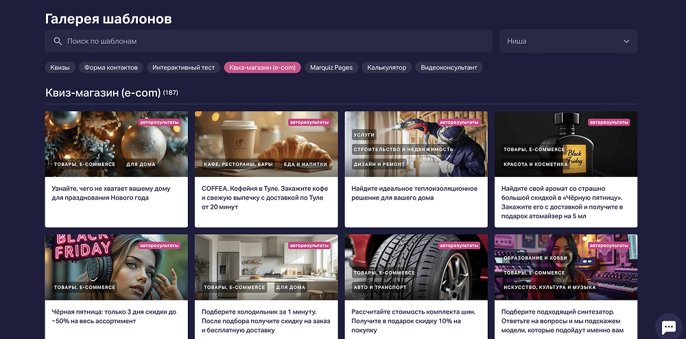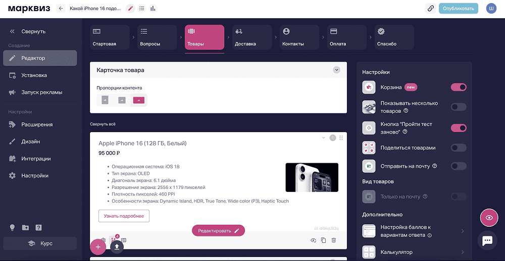 Особенность: Марквиз — это конструктор квизов, в котором можно собрать альтернативу классическому интернет-магазину. Квиз-механика подбирает товар через вопросы: сначала квиз выясняет потребности, а потом показывает подходящие варианты товара, которые можно оформить в заказ и оплатить. Так получается квиз-магазин.