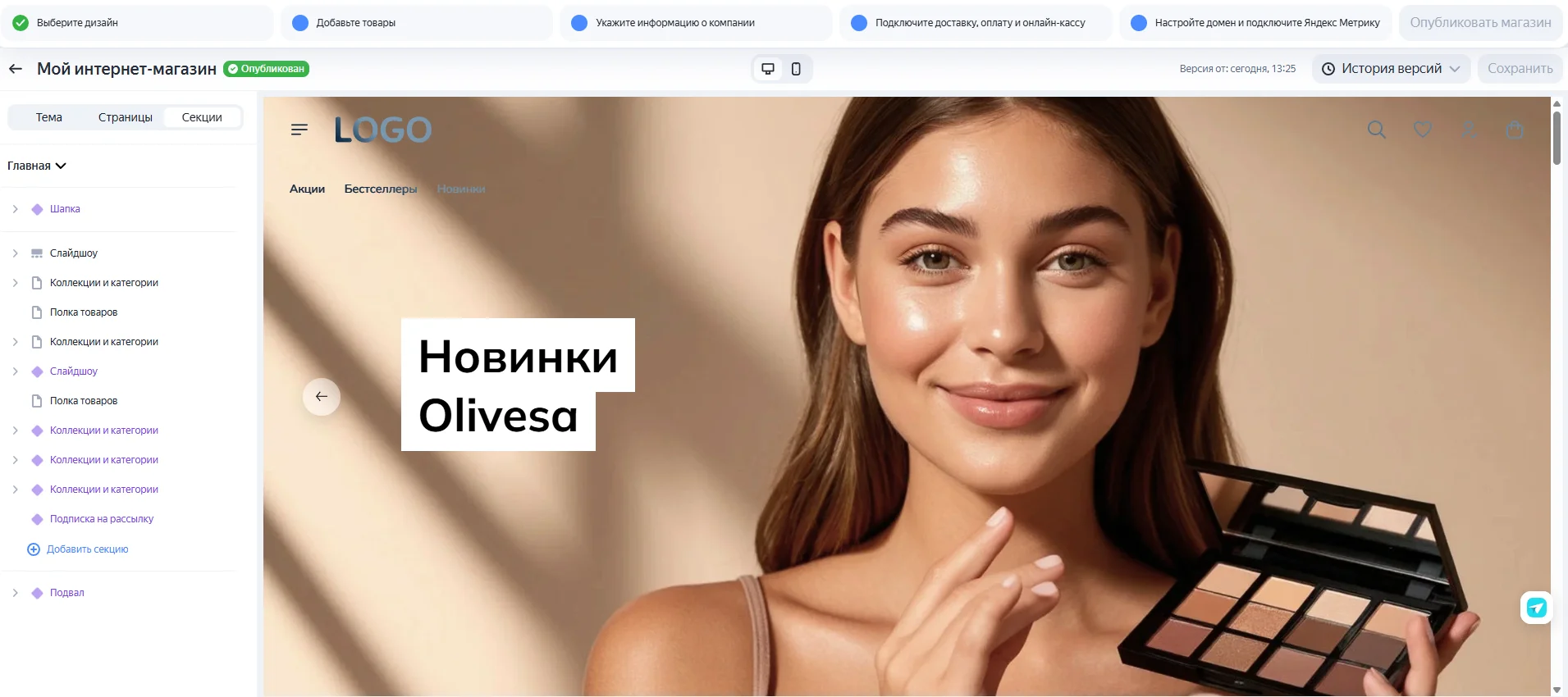 Яндекс KIT — платформа для быстрого запуска интернет-магазина без программирования. Позволяет собрать сайт из готовых блоков, подключить оплату и доставку, настроить аналитику и продвижение в едином интерфейсе. Магазин интегрируется с экосистемой Яндекса и сторонними сервисами, а ИИ-ассистент помогает генерировать контент и анализировать продажи.
