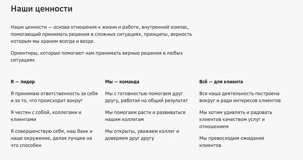 Например, миссия Сбера — давать людям уверенность и надежность, что компания делает их жизнь лучше, помогает реализовывать устремления и мечты. Ценности — принимать на себя ответственность, быть честными, постоянно развиваться и совершенствовать себя, банк и наше окружение и т. д.