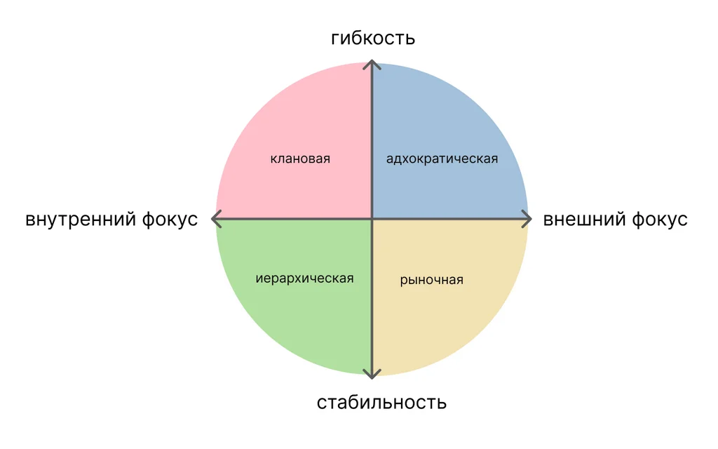 У корпоративной культуры есть разные классификации, мы рассмотрим одну из них — версию американских исследователей Ким Камерона и Роберта Куинна. Они классифицировали культуру по двум измерениям: гибкость и стабильность, внешний и внутренний фокус.