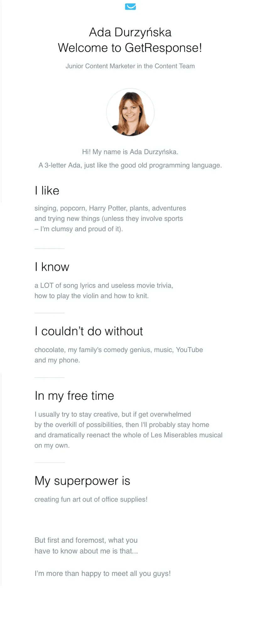 UGC. В вашей компании наверняка есть люди, которые хотят рассказать о себе. Цель может быть разной: у кого-то сайд-проект, кто-то новенький и вообще недавно переехал в город, но общительный и хочет подружиться, кто-то смешно зафакапился на последнем проекте и хочет всем рассказать, чтоб поржали. Для таких людей можно ввести рубрику в регулярной рассылке или добавить в неё формат «Письмо от коллеги».