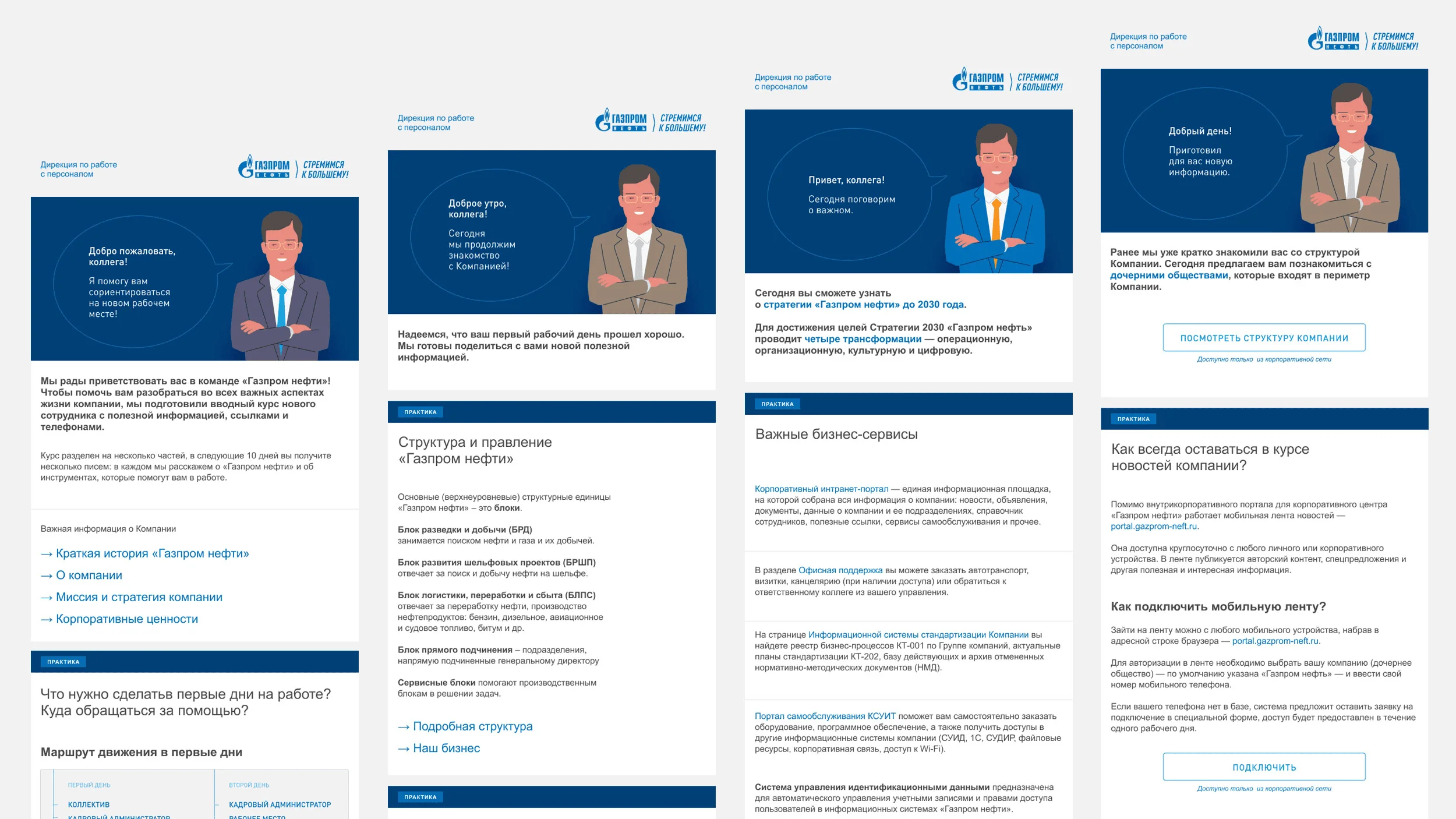Агентство HeadSpace, например, сделало серию онбординг-писем для новых сотрудников «Газпром Нефти». В них — перечень полезных сервисов, структура компании и другие полезные материалы для знакомства с компанией.