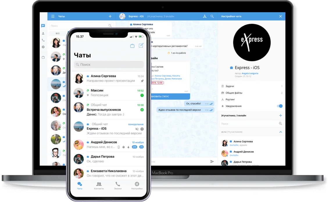 eXpress — сервис для корпоративного общения, объединяющий функционал классического мессенджера с бизнес-функциями.