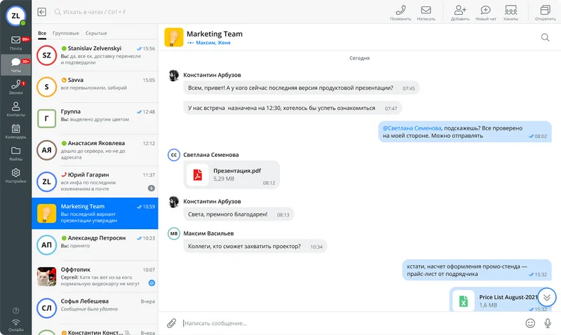 В мессенджере предусмотрена интеграция с разными полезными инструментами — CRM, почта, документы и прочее. Но комплектация зависит от выбранной версии продукта.