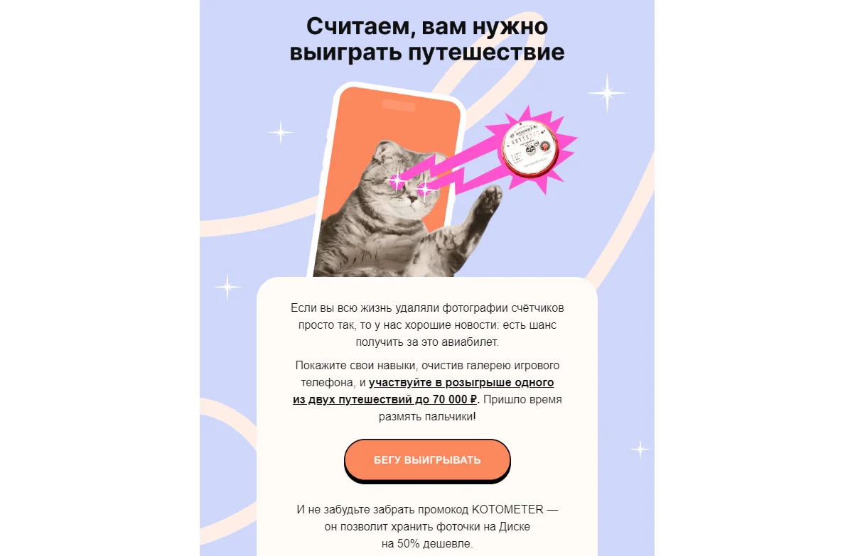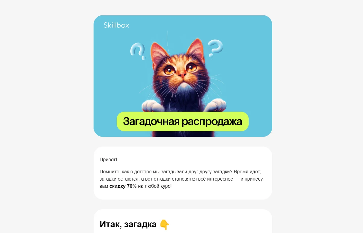 Если вам казалось, что тренд на картинки с котами остался в конце 2010-х годов, спешу разубедить — эти звери незаметно захватили мир маркетинга. Как минимум у меня за прошедший год накопились десятки писем с котами всех пород, цветов и размеров. Возможно, вскоре котики станут самодостаточным элементом дизайна — как кнопки или иконки.