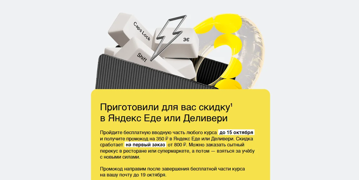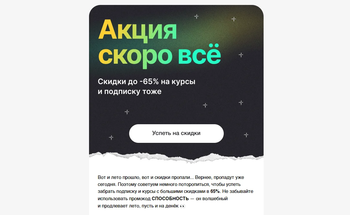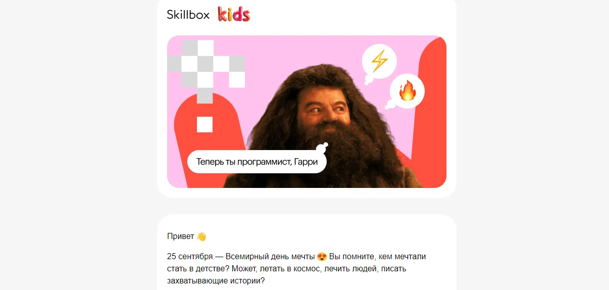 Еще один пример интересной верстки рассылки от Skyeng. Письмо разбито на несколько блоков на белых плашках. В начале плашек лиловые баннеры — то узкие, то более широкие. Сам контент нескучно организован: где-то разбит на два столбца, где-то используют рамки для выделения текста и добавляют мемы. В таком формате пользователь легко воспримет образовательные материалы, даже если открыл письмо на бегу.