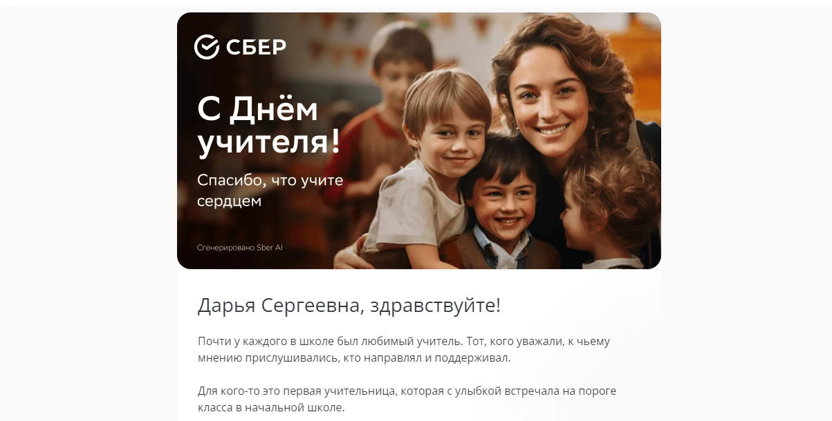 Часто попадаются сгенерированные фото людей. Сформулировать промпт и нажать на кнопку гораздо дешевле, чем организовывать фотосессию, и быстрее, чем искать нужный ракурс на стоках. Иногда в работах ИИ видны неточности анатомии, складок одежды, падающих теней. А иногда — просто необычайно гладкая кожа, идеальная прическа и смутное ощущение, что этот человек «нереальный». Но большинство пользователей не будут так вкрадчиво всматриваться. В рассылке Сбера даже специально подписали, что фото сгенерировано в собственном сервисе Sber AI — чтобы лишний раз впечатлить подписчиков мощью нейросети.