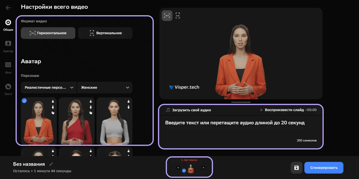 Текст озвучки всё же придется написать самостоятельно — Veed.io пока не создаёт готовые сценарии. При этом для ИИ-аватара действует ограничение: не более 90 символов на одну сцену. Это позволяет сохранить естественное звучание голоса и точную синхронизацию с видеорядом.