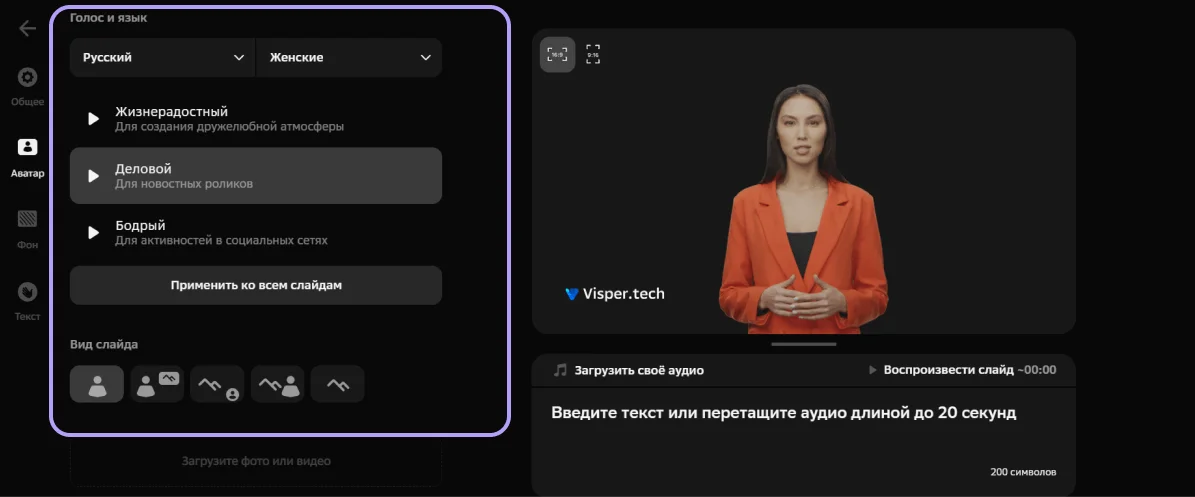 Далее выберите голос, интонацию и язык озвучки. Эту настройку можно применить ко всем слайдам.