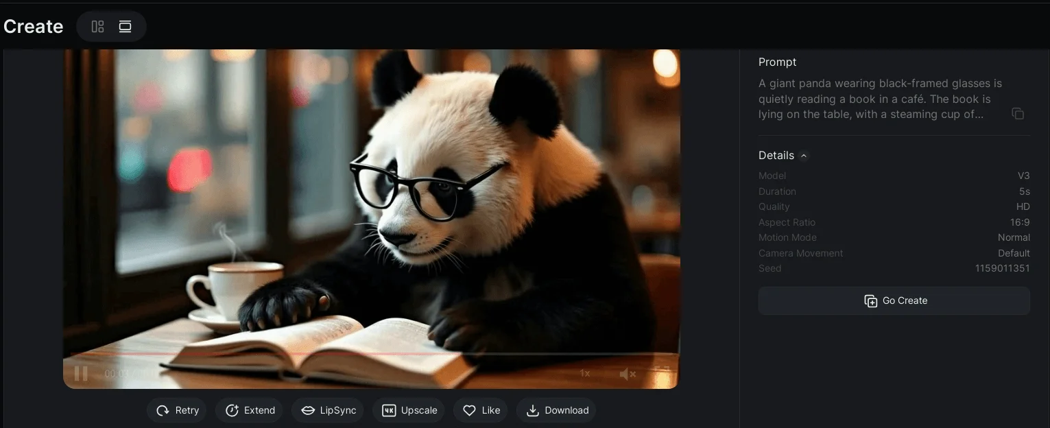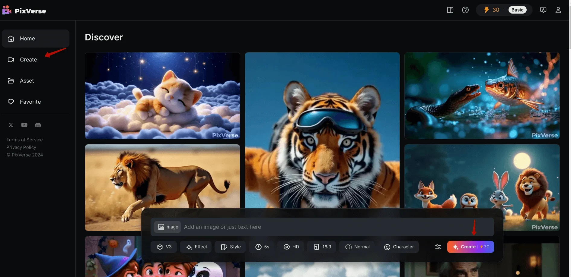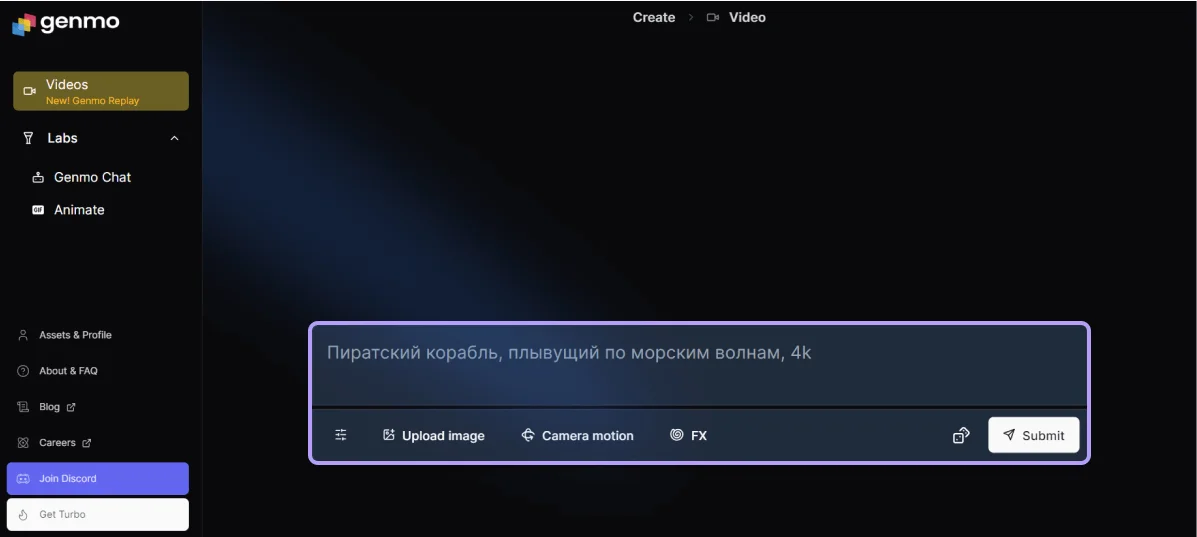 Чтобы создать свое видео — перейдите в раздел Create или введите промпт в нижней строке и нажмите Create.