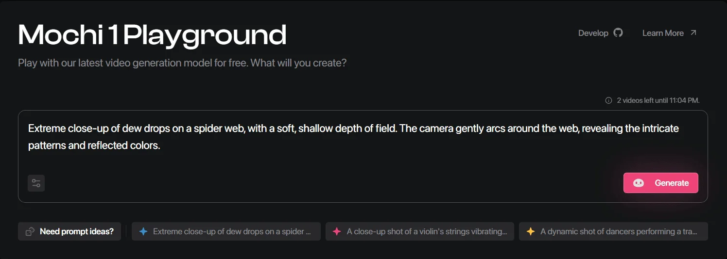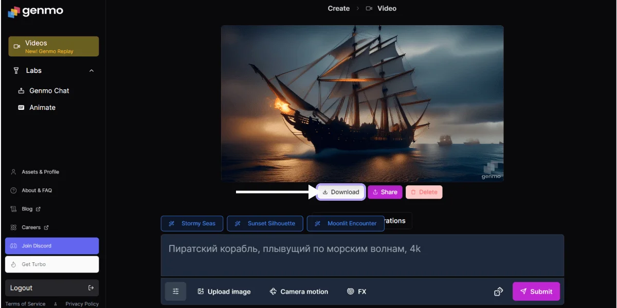 Зарегистрируйтесь в Genmo и перейдите в редактор. Введите промпт для создание видео и по необходимости измените настройки.