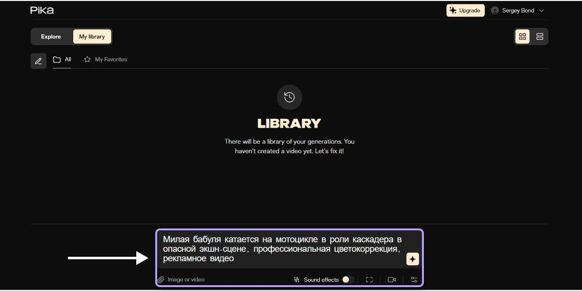 Введите свой запрос в текстовое поле. Рядом с полем для промпта есть иконка волшебного карандаша — это функция улучшения запроса. Нажмите на нее, чтобы нейросеть сама доработала вашу идею. Эта функция повысит яркость, добавит больше цветов и движений на вашу генерацию.
