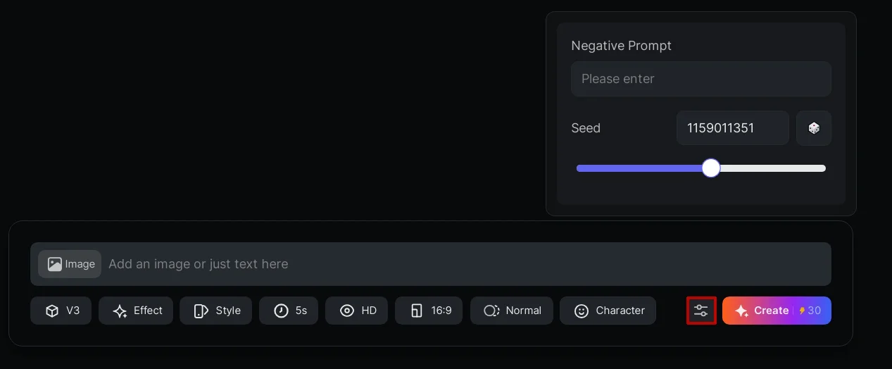 В строке Prompt введите текстовый запрос — опишите, что должно быть в видеоролике. Также вы можете нажать на иконку параметров и в строке Negative Prompt указать, чего в видео быть не должно.