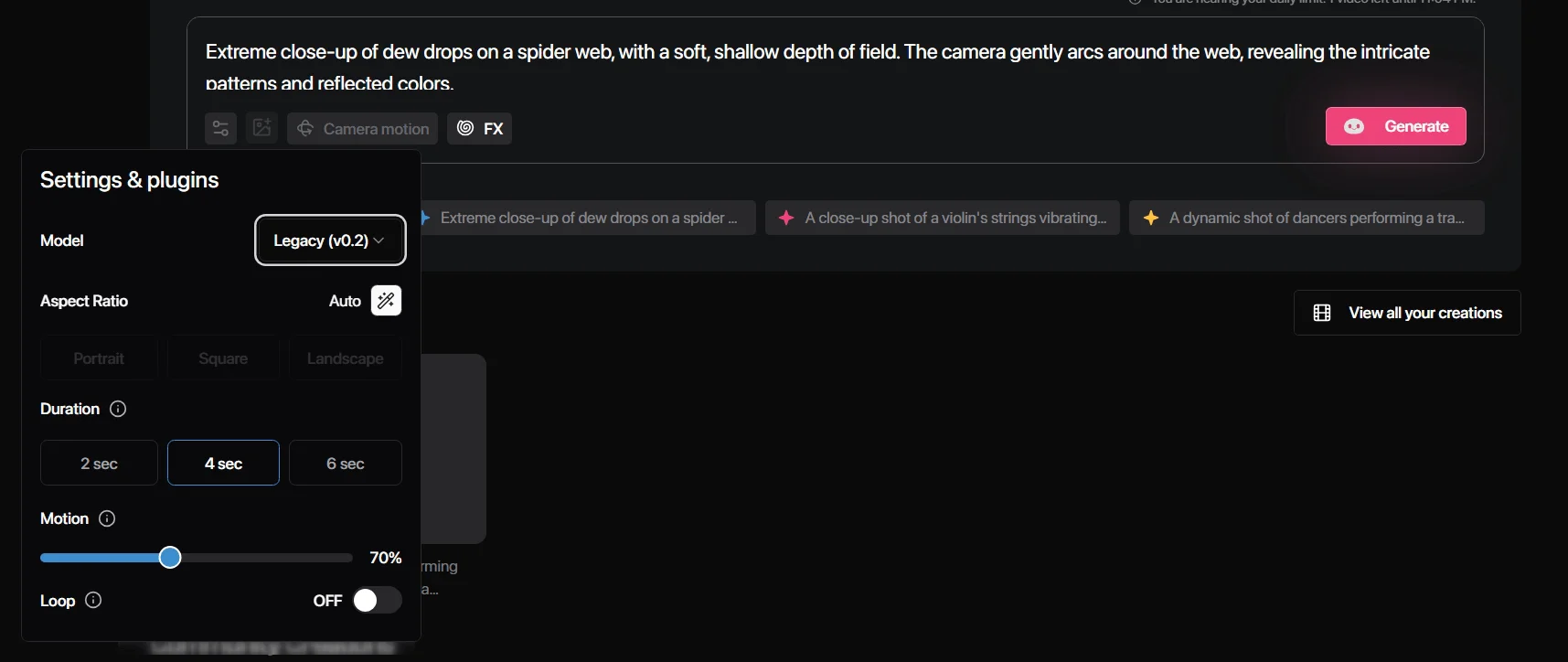 В параметрах можно поменять модель нейросети. Сейчас доступно 2 модели: Mochi и Legacy. В первой можно генерировать видео только по текстовому запросу. А в Legacy можно настраивать движение камеры, накладывать эффекты, оживлять картинки.
