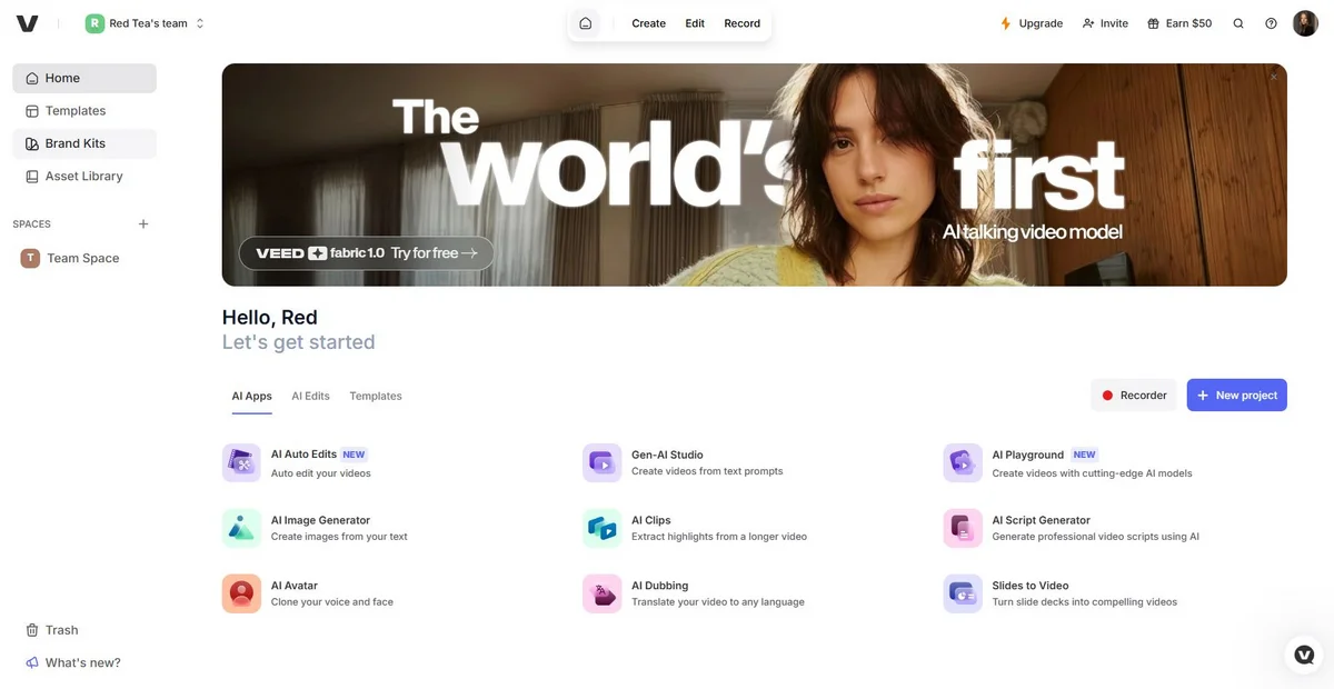 После регистрации на сайте вы попадаете на главный экран Veed.io. Нажмите кнопку New project — откроется редактор, где вы сможете работать с видеоматериалами.