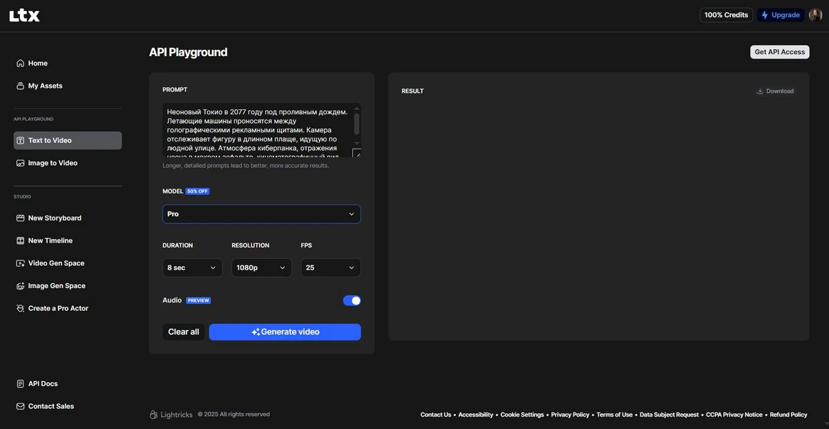 Для быстрой генерации видео перейдите в раздел API Playground — это тестовая площадка, где можно ввести текстовый промпт и мгновенно получить результат.