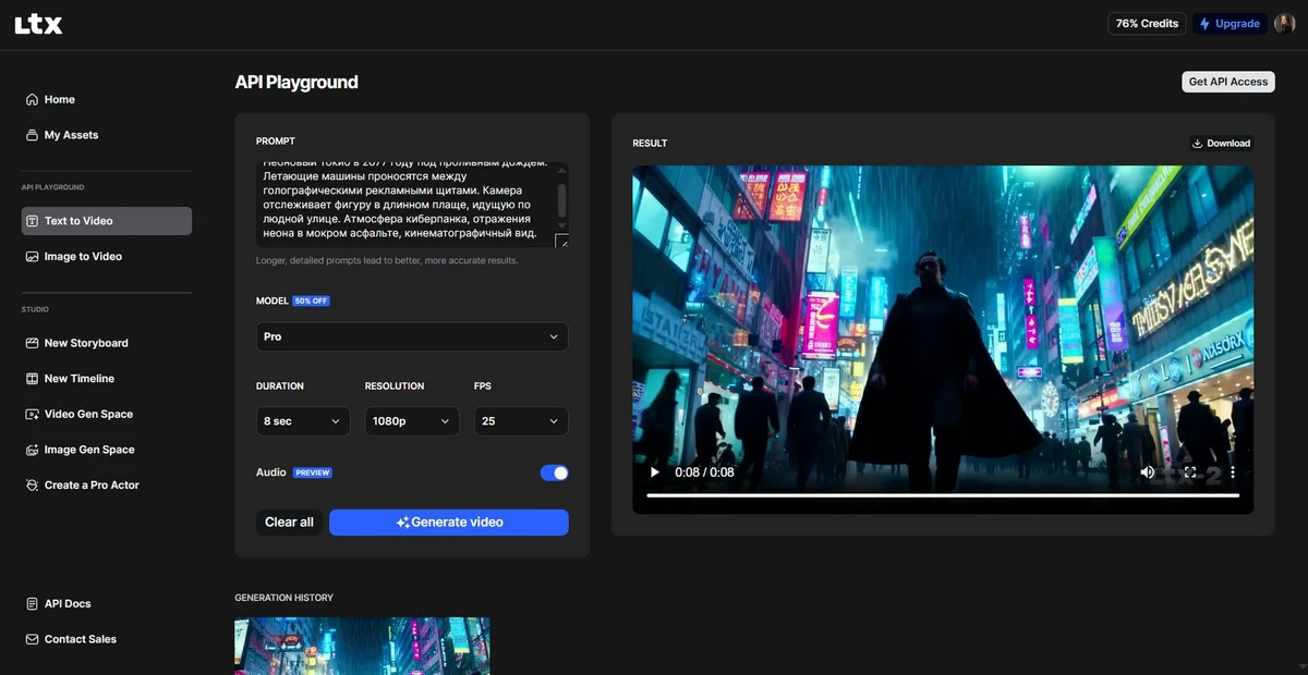 После настройки параметров нажмите Generate video — готовый ролик появится в окне RESULT, где его можно просмотреть и скачать.