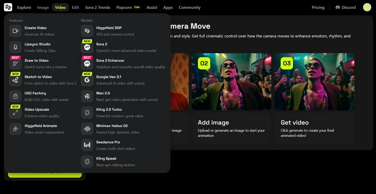 Higgsfield — платформа для генерации видео с помощью ИИ, специализирующаяся на создании кинематографических эффектов и динамичных движений камеры. Сервис ориентирован на создателей контента, маркетологов и видеографов, которым нужно быстро получить видео с профессиональным визуальным качеством и стильной подачей.