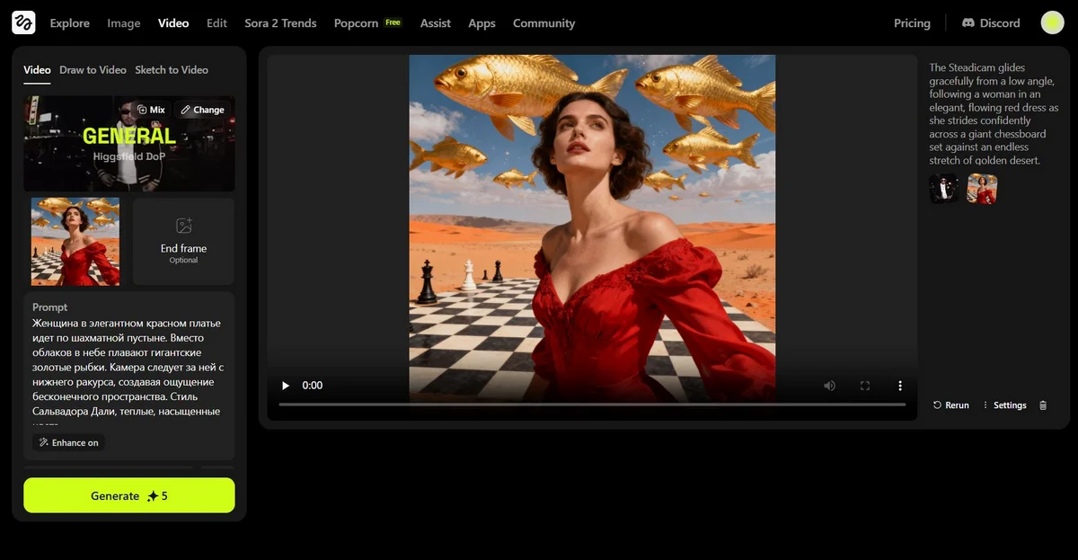 Введите ваш промпт в текстовое поле. Справа будут настройки: можно задать длину видео, выбрать соотношение сторон (например, 16:9 для YouTube или 9:16 для TikTok) и настроить движение камеры. Для более точного контроля над анимацией используйте ключевые кадры (keyframes) — для этого нужно задать начальную и конечную точки движения. Когда все будет готово, нажмите кнопку Generate. Через несколько минут видео будет готово.