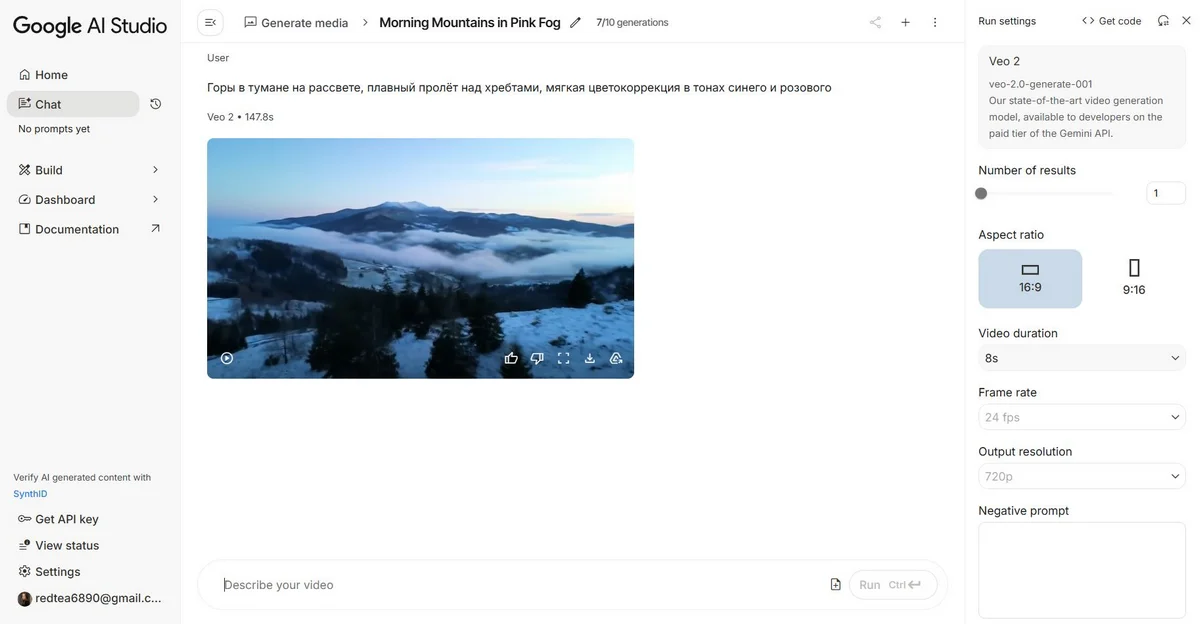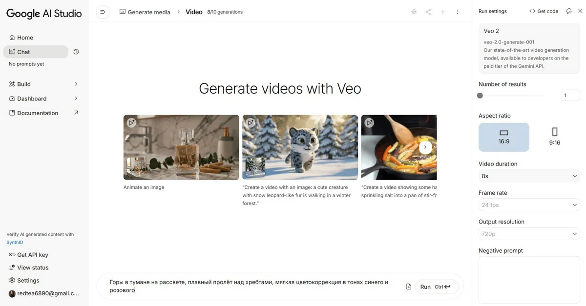 Стоимость. Последние версии моделей Veo 3 и Veo 3.1 можно использовать в Gemini, нужна платная подписка: Google AI Pro за $20 в месяц или Google AI Ultra за $249. У Pro-аккаунта есть лимит — можно сгенерировать всего 10 видео. У Ultra ограничений нет. Бесплатно можно генерировать видео в модели предыдущего поколения — Veo 2. Она доступна в Google AI Studio. Для интеграции в собственные приложения модель доступна через Gemini API на платной основе.