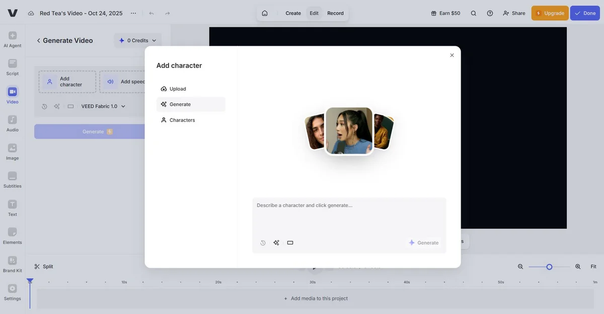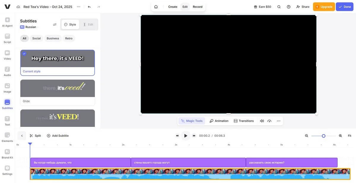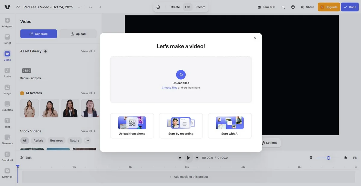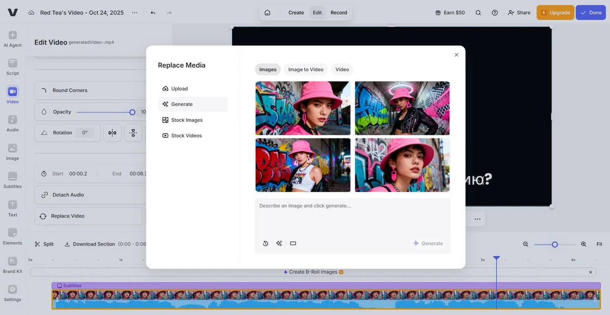 Veed.io — сервис с инструментами ИИ, которые упрощают создание и редактирование видео. Сервис подходит для блогеров, маркетологов и авторов образовательного контента. Здесь можно генерировать ролики по текстовому запросу, редактировать уже готовые видео, добавлять субтитры, музыку, аватары и даже удалять шум из аудио.