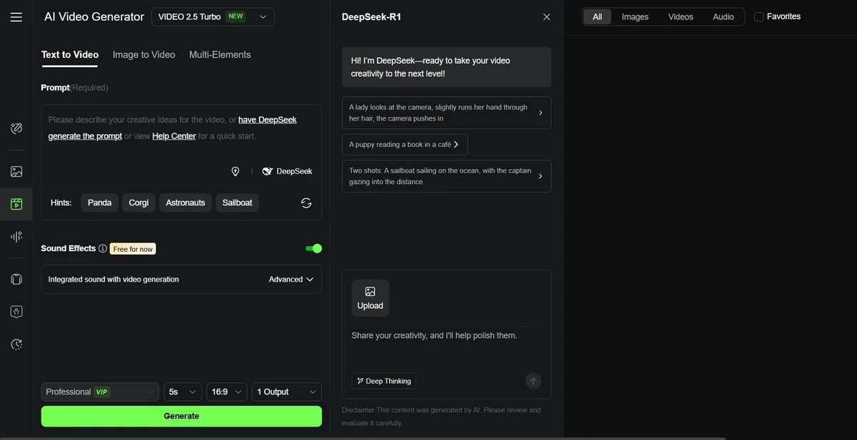 После регистрации в сервисе перейдите в редактор. В строке запроса введите промпт и на панели настроек установите соотношение сторон, соответствие тексту, скорость движения и добавьте по желанию звуковой эффект.