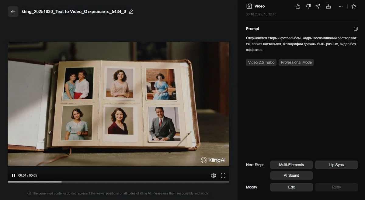 Финальный этап — генерация видео (Get video). Здесь вы можете выбрать модель ИИ, задать длительность ролика, разрешение и другие параметры. После настройки всех опций нажмите Generate. Полученный ролик можно сразу просмотреть, скачать на компьютер или поделиться им в социальных сетях.