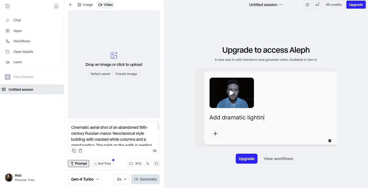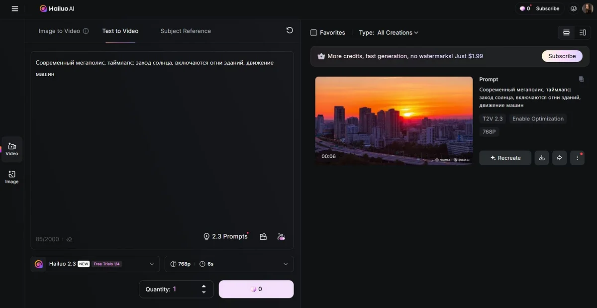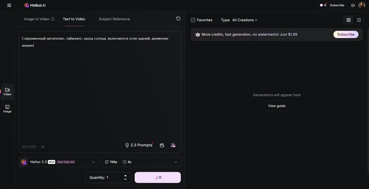 После регистрации вы попадете на главный экран. Слева находится панель для создания видео. Выберите нужный режим: Text to Video, чтобы сделать ролик по текстовому запросу, или Image to Video, чтобы оживить картинку.