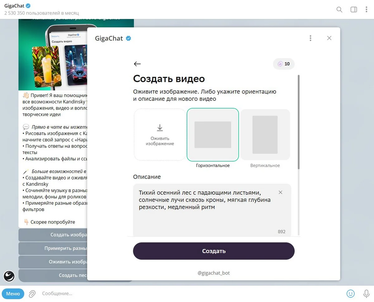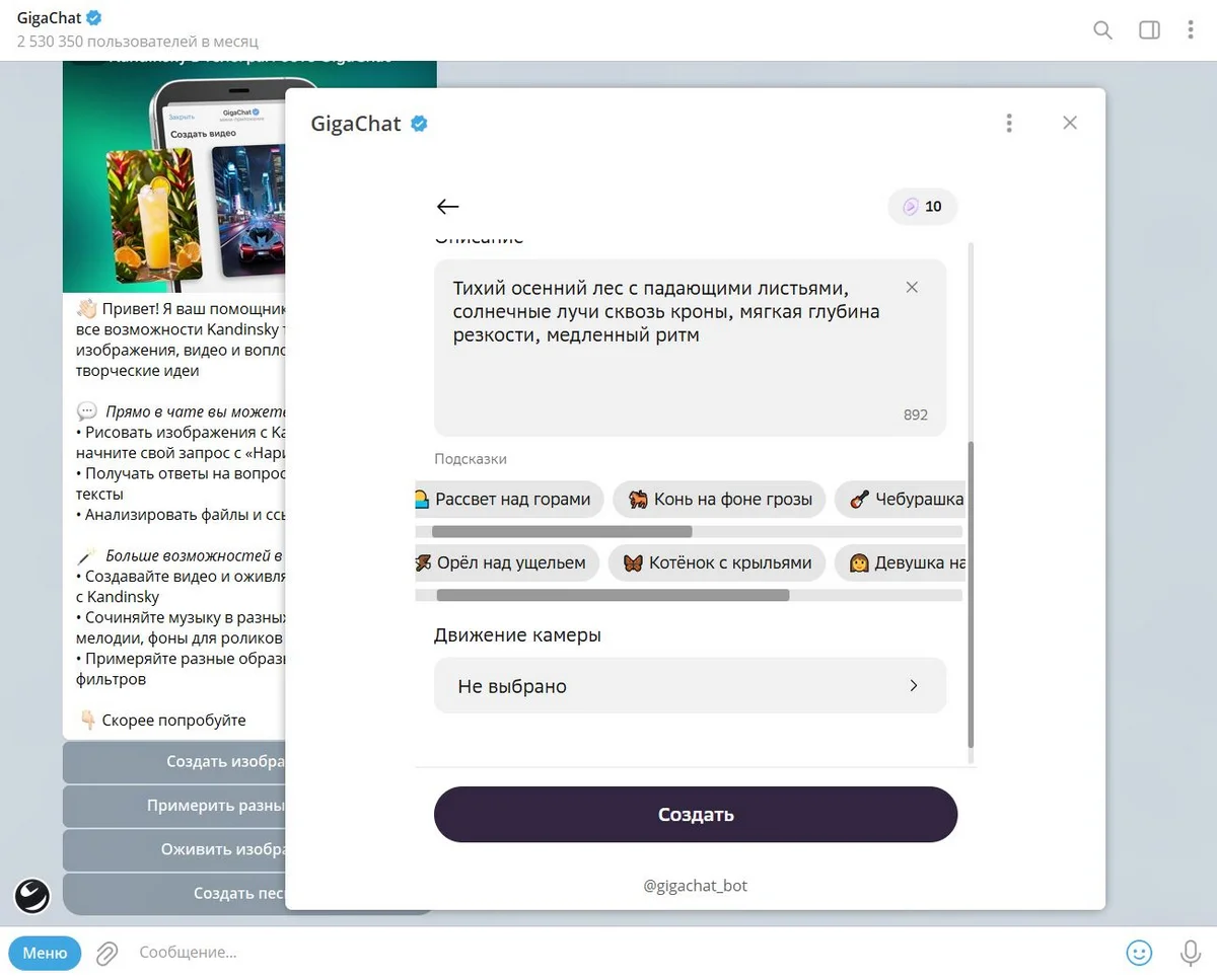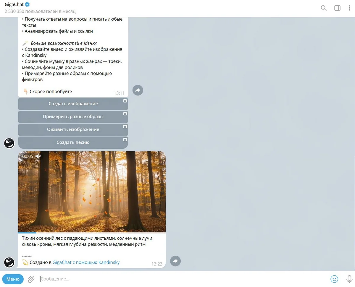 Создавать видео с помощью Kandinsky можно через Telegram-бот GigaChat. Достаточно запустить бота и открыть меню — там сразу появятся все нужные инструменты. Если не знаете, с чего начать, бот предложит идеи для генерации.