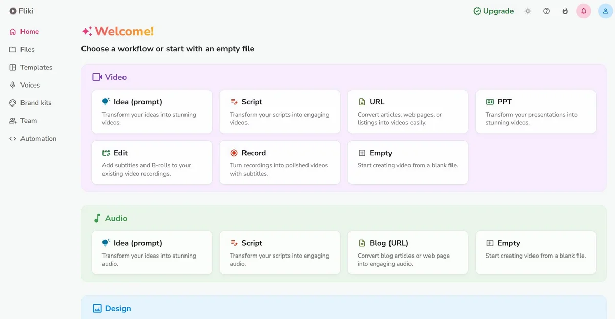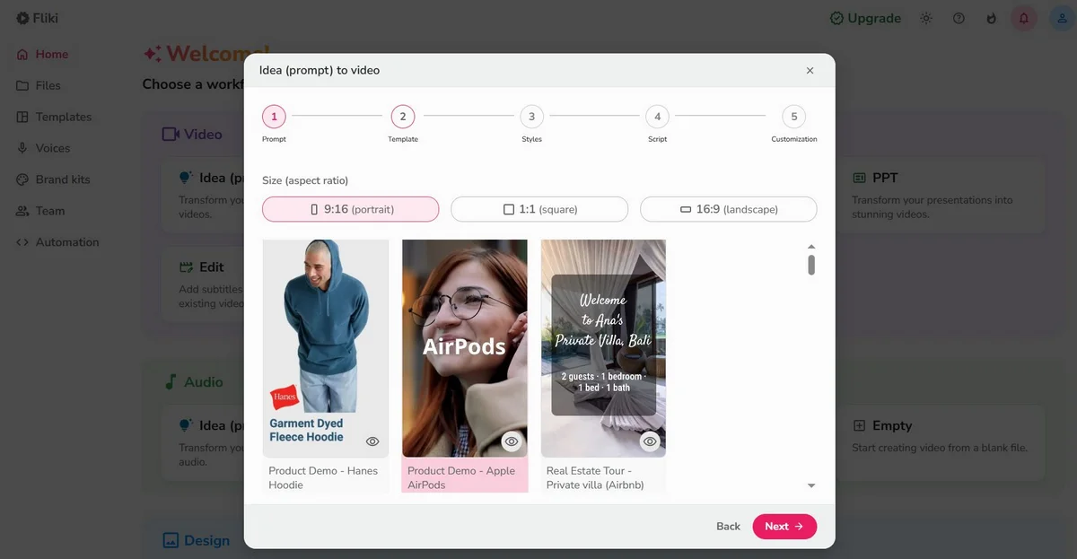Зарегистрируйтесь или войдите в аккаунт на сайте Fliki. На главной панели нажмите Idea (prompt) в разделе Video. Задайте имя проекта, язык озвучки и соотношение сторон (например, 16:9 для YouTube или 9:16 для Stories).