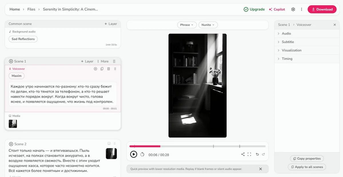 Когда все сцены подготовлены, озвучка и музыка настроены, просмотрите видео. Если результат вас устраивает, нажмите Download. Fliki обработает проект и предоставит готовый файл для скачивания.