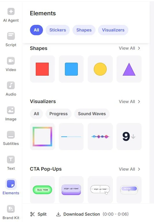 В редакторе можно дополнительно украсить видео визуальными элементами. Например, добавить текст во вкладке Text и выбрать для него подходящий шрифт, размер и стиль оформления. В библиотеке Elements также доступны стикеры, анимированные стикеры, фигуры (Shapes), визуализаторы звука (Visualizers) и всплывающие элементы призыва к действию (CTA Pop-Ups).