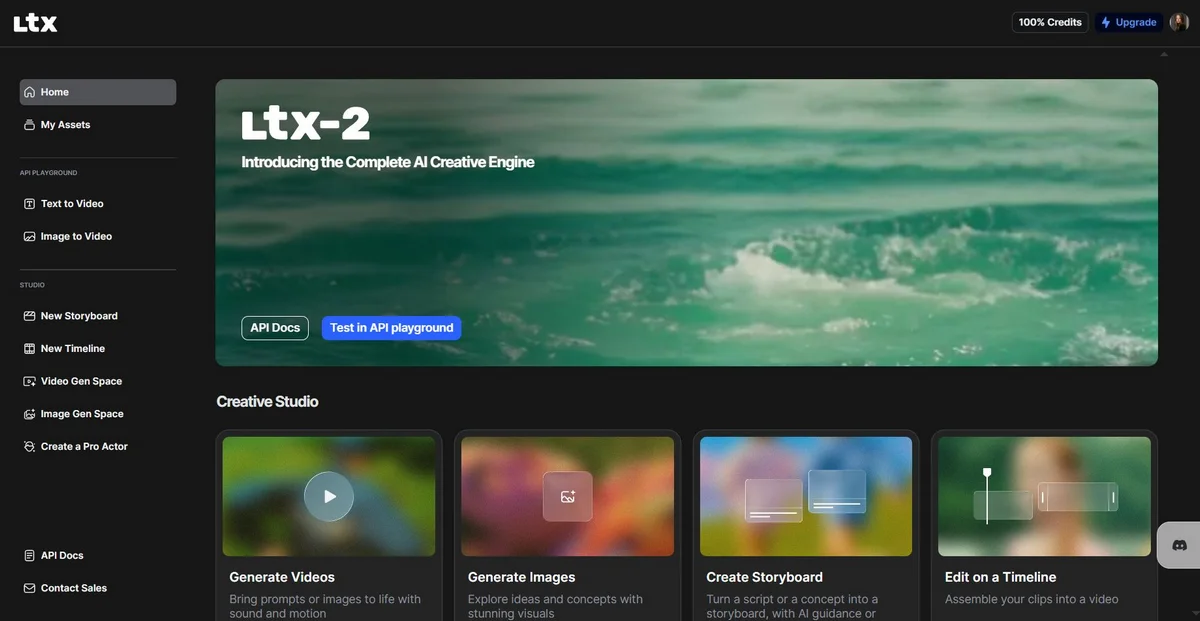 После регистрации вы попадаете в Creative Studio — главный экран платформы, где собраны основные инструменты: Generate Videos, Generate Images, Create Storyboard и Edit on a Timeline.