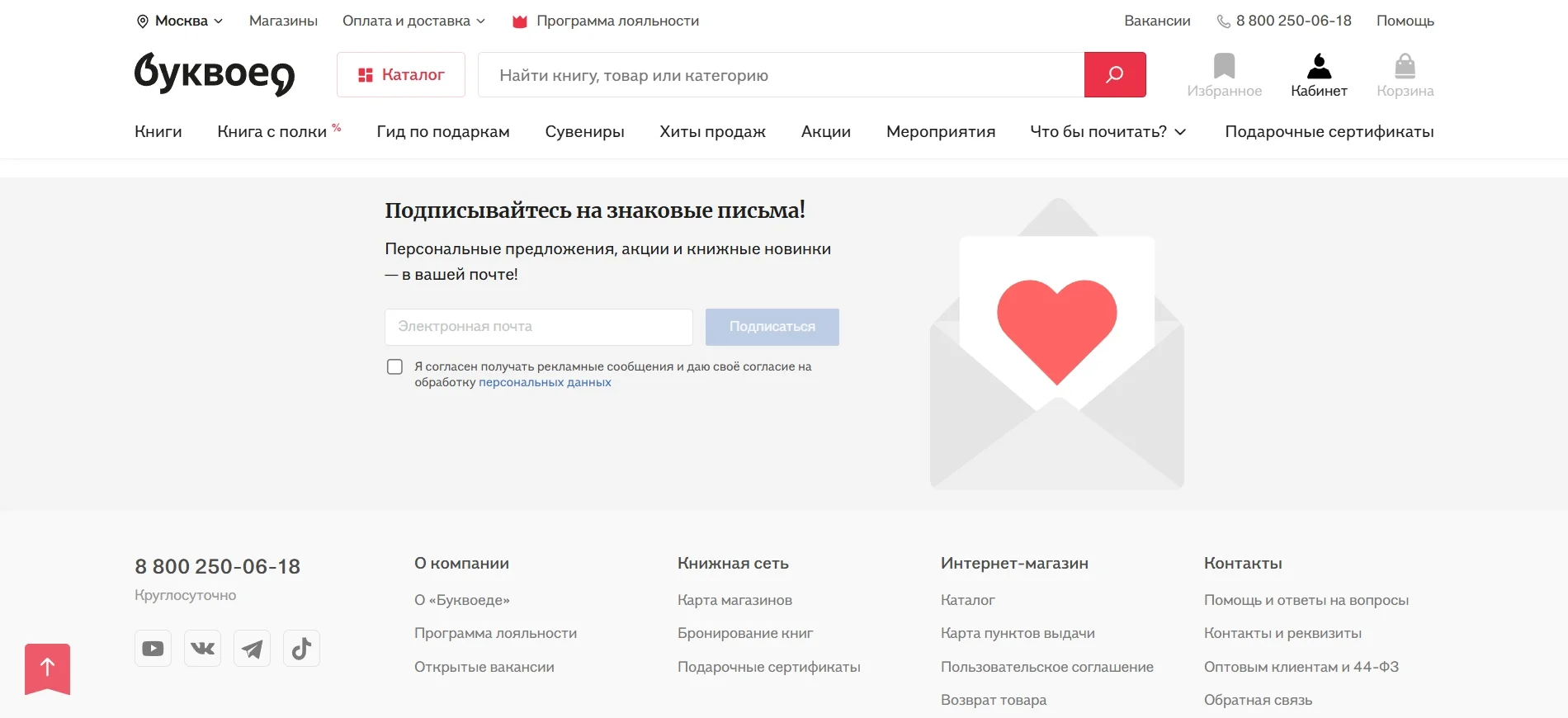Форма на сайте «Буквоеда» расположена над подвалом и выглядит как огромный баннер