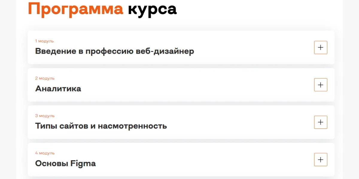 На курсе ученики занимаются реальными проектами. Они проходят через уровни, как в игре, и работают с брифами от заказчиков. Особое внимание уделяется юзабилити — принципов, которые обеспечивают удобство пользователя на сайте. Также опытные лекторы рассказывают, как общаться с клиентами и находить интересные заказы.