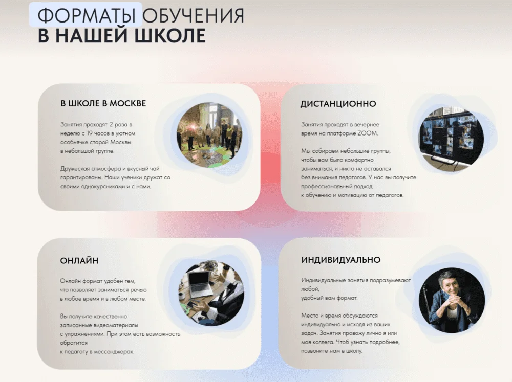 Онлайн-курсы охватывают от азов до продвинутых навыков: техника речи, дикция, интонация, мимика, язык тела и логика мысли. Дистанционный курс «Искусство оратора» включает семь практических Zoom-уроков по три часа с обратной связью в группе до 15 человек. Офлайн-интенсив — это три вечера в московском офисе школы, упражнения, методические материалы и групповое взаимодействие в формате живых занятий. Также есть программы индивидуального обучения.